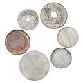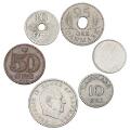 Small lot of 10, 25 and 50 øre and 1 kr where the coins either have the wrong hole, are worn or have had some of the obverse/reverse removed, in total 6 pcs