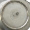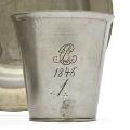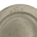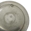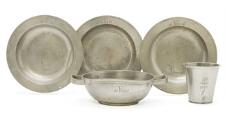 Three 19th century pewter plates Diam- 23–5 cm, a food bowl Diam. 21 cm and a mug H. 11 cm. Maker Lorentz Casper Wilhelm Buntzen, made for the Royal Military Hospital in Copenhagen. (5)