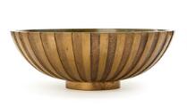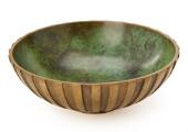Cirkulær skål af poleret bronze støbt med kanneleret dekor, indvendigt grønpatineret. Stemplet Tinos Ægte Bronce, Made in Denmark. H. 7,8. Diam. 22.
