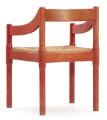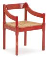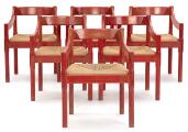 “Carimate”. Set of six red stained beech armchairs. Seat stretched with woven seagrass. Designed 1959. Manufactured by Cassina. (6)