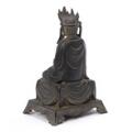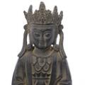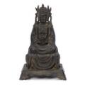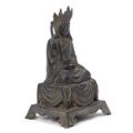 Kinesisk figur af patineret bronze i form af Guanyin siddende på trone, iført folderig dragt, krone og smykker. Ming stil og senere. Vægt 2232 g. H. 24 cm.