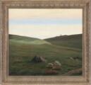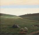 Aftenlys over et landskab med græssende får nær en kyst. Sign. H. Foss. Olie på lærred. 70×78 cm.