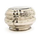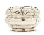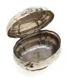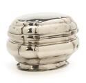 Tysk rokoko sukkerskrin af sølv, af oval bombé form, skævknækket med hængslet låg og fliget base. Mester Gottlieb Satzger, Augsburg 1771–1773. Vægt 296 g. H. 9 cm. L. 14 cm.