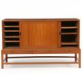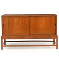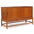 Skænk af mahogni. Front med to skydelåger, herunder to udtræksplader med greb af sort ebonit. Sider med greb af messing. Indvendigt med udtræksbakker. Model 4122. Formgivet 1930. Udført og hos Rud. Rasmussen snedkerier, med etiket herfra. H. 96. B. 152. D. 60.