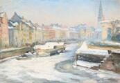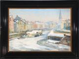 Gammel Strand og Thorvaldsens Museum set fra kanalen. Sign. E. K. Olie på lærred. 48×69.
