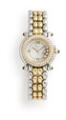 Happy Sport of 18k gold and steel, ref. 8245. Quartz movement. 2010s. Bezel set with numerous brilliant-cut diamonds. Dial with five floating brilliant-cut diamonds. Chopard bracelet of 18k gold and steel. Circumference approximately 16 cm. Diameter 26 mm.