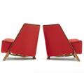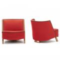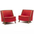 A pair of easy chairs with patinated oak frame. Seat sides and back upholstered with red wool. Made 1930–1940s. (2)