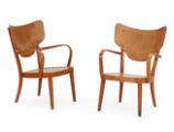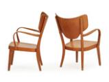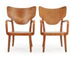 Et par armstole med stel af formbøget bøg, sæde og skjoldformet ryg af lamineret bøg. Model 2280. Udført cirka 1940'erne og stemplet hos Fritz Hansen. (2)