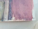 Akvarellen er fin med mindre slidspor på nogle af kanterne. Monteringspapiret er lidt medtaget og pappet med dedikationen er knækket.