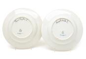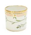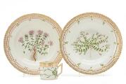 “Flora Danica” two deep plates and chocolate cup of porcelain, decorated in colors and gold with flowers. 3545 and 3513. Royal Copenhagen. Diam. 25.5 cm. (3)