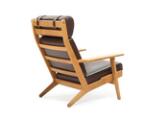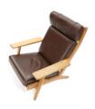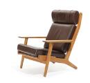 “GE 290A”. A highback oak easy chair, loose cushions with brown leather. Manufactured and marked by Getama.