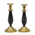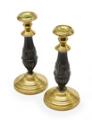 A pair of late 19th century Victorian brass and patinated bronze candlesticks on vaulted and round bases. Filled. H. 21.5 cm. (2)