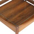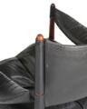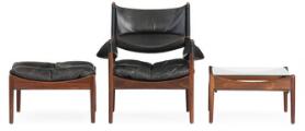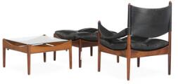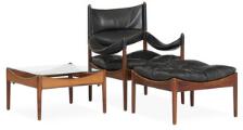 Rosewood easy chair, stool and coffee table. Seat, back and armrests upholstered with black leather. Coffee table with glass top and reversable aluminium/rosewood shelf. Manufactured and marked by Søren Willadsen. (3)