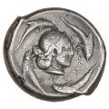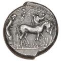 Ancient Greece, Sicily, Syracuse, Deinomenid Tyranny, Gelon I, 485–479 BC, Tetradrachm, a. 482–480 BC, Charioteer driving quadriga right, Nike flying above / Head of Arethusa right, surrounded by four dolphins, 17.16 g, Boehringer 94 (V45/R63), SNG ANS 25.