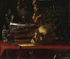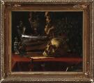 Still life with a skull, books and precious art objects. Unsigned. Inscribed AS. Oil on canvas. 57×66 cm.