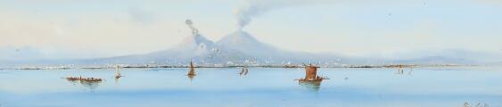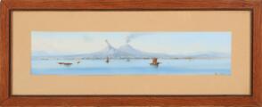 Parti fra Napoli med udsigt til Vesuv. Sign. Rosa Corelli. Gouache på papir. Bladstørrelse 10×44.