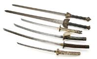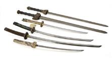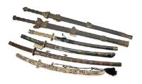 A collection of six Chinese and Japanese swords for decoration consisting of a Chinese? made Japanese katana with approx. 72 cm. long blade in scabbard decorated with flowers, another with approx. 61.5 cm. long blade in scabbard decorated with a Chinese landscape, a brass-plated do with a grip in the shape of a dragon's head and approx. 50.5 cm. long blade in a black-lacquered wooden scabbard, two large Chinese swords in scabbards and a Japanese bone Wakizashi with approx. 44 cm. long “blade” with bone grip and scabbard decorated with depictions of folk life.