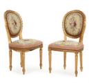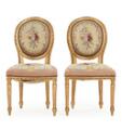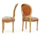 Et par stole af guldbronzeret træ, sæde og ryg med sømbeslået, broderet møbelstof, medaljonformet ryg, udskåret med lettilspidsede kannelerede ben og ornamentik. Rokoko form. 19. årh.s. slutning. (2)
