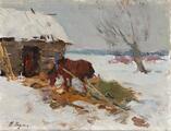 “Vinter”. Russisk vinterlandskab med en trojka-forspændt hest ved en hytte. Sign. I. Putiatin (med kyrilliske bogstaver). Olie på malepap. 27×35. Uindrammet.