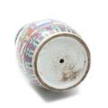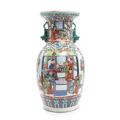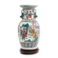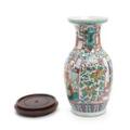 Kinesisk balusterformet vase af porcelæn, dekoreret i farver med paladsscener, omgivet af blomster og ferskner på lys grund. Stand af træ. 20. årh. H. 38 cm.