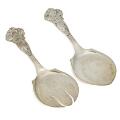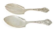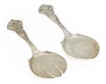 Fiskeserveringssæt af sølv, skafter drevet med fisk og tang. Danmark, 1947. Vægt 241 gr. L. 25 cm. (2)