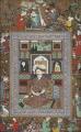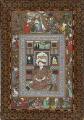 A nobleman seated with two attendants in a window, borders with numeruous figures and design. Gold and colours on paper. Signed Mahdi Al-Imani. Colour and gold on paper. Framed. Visible size 41×26 cm.