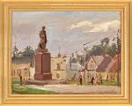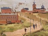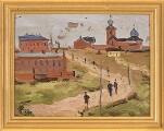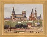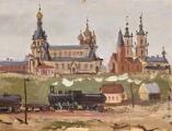 Three Russian futuristic city views, with e.g. statue, locomotive, churches, and factory buildings. One signed S. V., two signed S. Vinogradov (in Cyrillic). Oil on wood. 16×21 cm. each. (3).