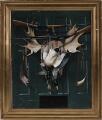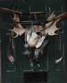 Trompe l'oeil med fuglevildt, gevir, jagtgevær og krudthorn hængende på en væg. Print i farver på metal. 91,5×76 cm.