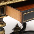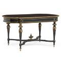 A French Napoleon III center table of black painted wood, inlaid with brass moldings and adorned with gilt bronze fittings, front with drawer. Late 19th century. H. 75 cm. L. 140 cm. W. 80 cm.
