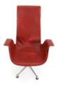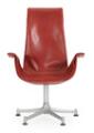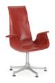 “Tulip”. Drejestol med fempasfod af stål. Sæde, sider og ryg betrukket med rødbrunt skind. Udført og mærket hos Kill International.
