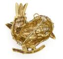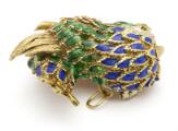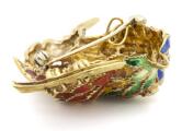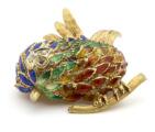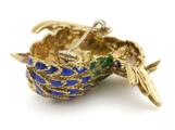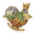 Emaljebroche/vedhæng af 18 kt. guld i form af fugl prydet med farvet emalje, facetslebet klar sten og brillantslebne diamanter. Vægt ca. 24 g. L. 4,2 cm.