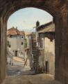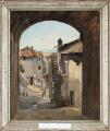 An Italian village with a view through a gate. Unsigned. Oil on paper laid on board. Ca. 25×21 cm.