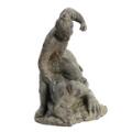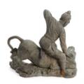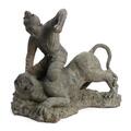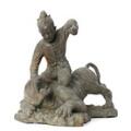 Asiatisk skulptur af grønpatineret metal i form af en mand kæmpende med en tiger. 20. årh. H. 54.