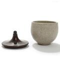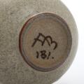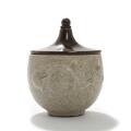 A stoneware lid jar with beige and blue-green glaze. Signed with monogram AB 181. With matching patinated bronze lid. H. 12 cm.