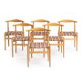 “FH 1934”. A set six lacquered beech armchairs upholstered in seats with striped wool. Designed 1949. Manufactured by Fritz Hansen. (6)