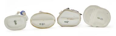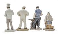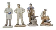Four porcelain figurines, decorated in underglaze. Confectioner, mason, blacksmith and shoemaker. 1786, 2429, 2225 and 2228. Bing & Grøndahl. H. 23–31 cm. (4)