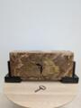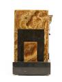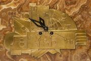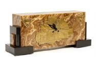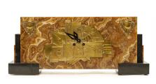 A French Art Deco onyx and black marble mantel clock of rectangular form adorned with bronze mounts, movement marked Sociéte Clusienne S.C.A.P.H. Cluses, France, c. 1930. H. 26 cm. W. 56 cm. D. 13 cm.