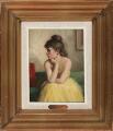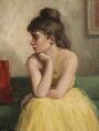 Interior with ballerina in yellow dress. Signed H. Helme. Oil on canvas. 25×19 cm.