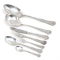 Bestående af: 12 middagsknive, 12 middagsgafler, 12 middagsskeer, 12 teskeer, 12 kagegafler, 1+1 serveringsske.