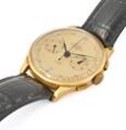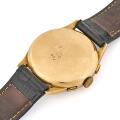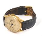 Wristwatch in 18k gold. Mechanical chronograph movement with manual winding. 1960s. Black alligator strap with a gold-plated steel pin buckle. Ø 37 mm.