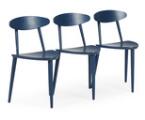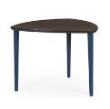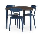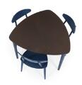 Dining table and three three-legged chairs of blue-painted wood, top of varnished wood veneer. Manufactured and marked by FDB. H. 68. L. 90. W. 90. (4)