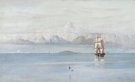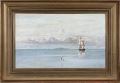 Kystparti med skibe på stille hav. Sign. Alfred Olsen. Olie på lærred. 34×56 cm.
