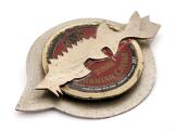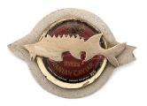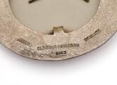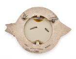 Broche af delvist forgyldt sterlingsølv prydet med udskåret stør fisk foran kaviarlåg af plast. Vægt ca. 31 g. B. 5,8 cm. L. 8,2 cm.