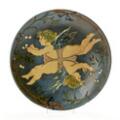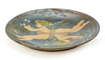 An earthenware dish modelled with incised motifs in the shape of two angels. Decorated with glaze. Signed with monogram and dated 1896 on the back. Diam. 37 cm.