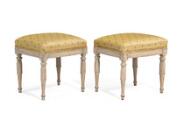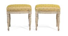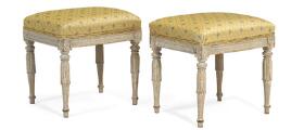 Et par gustavianske taburetter af bemalet træ, udskåret med rosetter og border, runde tilspidsede ben med bladværk. Stemplet 'IEH' for Johan Erik Höglander, mester i Stockholm 1777–1813. Sverige, 18. årh.s slutning. (2)