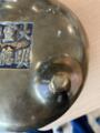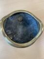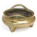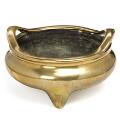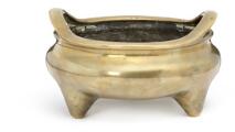 A Chinese tripod and twin handle bronze incense burner, base mark Xuande. Qing dynasty 18th century. Weight 1503 g. H. 10 cm Diam. 17 cm.