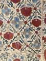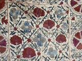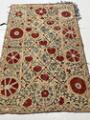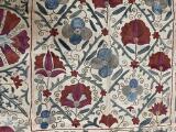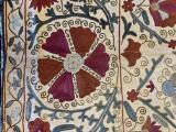 Suzani comes from the Persian word suzan, which means needle and the primary use was within the yurt (a Central Asian nomadic tent), as a protective wrapping panel for textiles and belongings. They were also used as prayer mats, as bed sheets and for seating — pieces of furniture are seldom found in yurts, because they are cumbersome to move. Suzanis had a symbolic significance, too. They were traditionally made by brides and their mothers as part of a dowry, and presented to the groom on his wedding day. They represented the binding together of two families, and were adorned with symbols of luck, health, long life and fertility.