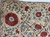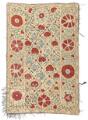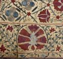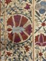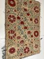 An Uzbekistan Suzani embroidery textile panel. The natural cotton ground embroidered in Romanian couched stitch with a broad border of rosettes, the field composed of central flowers and foliage in lattice design. Silk and cotton. C. 1900. 110×169 cm.