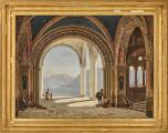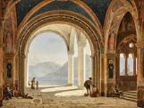 “Forhallen til en Klosterkirke; Motivet fra et Kloster, beliggende ved Gardasøen.” Udsigt mod Gardasøen og byen Malcésine fraklostrets forhal, Italien. Sign. P. Kornbeck 1878. Olie på lærred. 113×150.