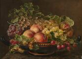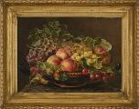 Still life with peaches, figs, grapes and currants in a kylix on a stone sill. Signed I.L. Jensen. Oil on panel. 31×42 cm.